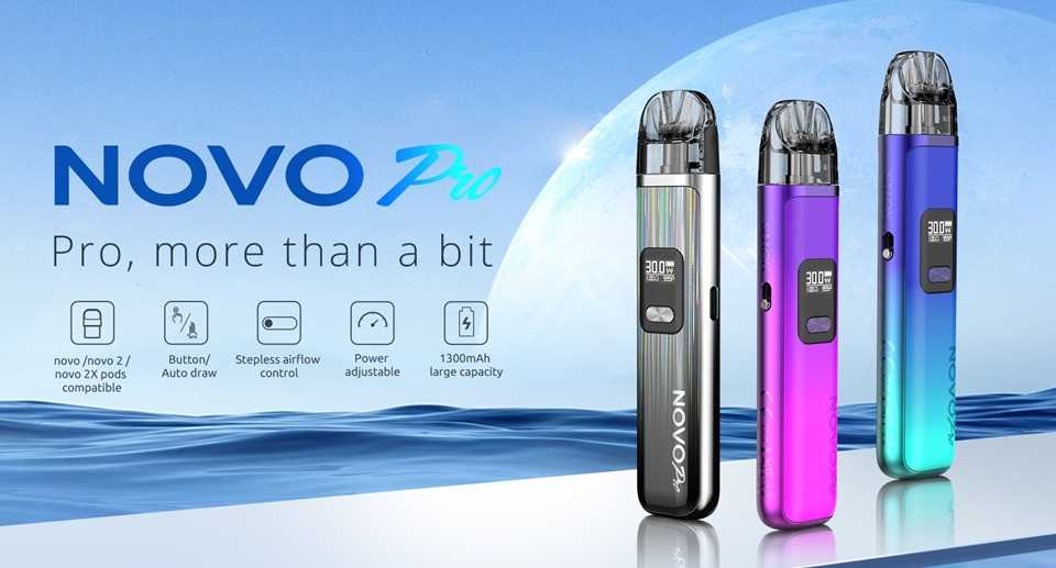 - SMOK Novo Pro – аккумулятор 1300 мАч, объем 2 мл, регулируемая мощность 5–30 Вт, сопротивление 0.6 и 0.8 Ом, дисплей, Type-C.